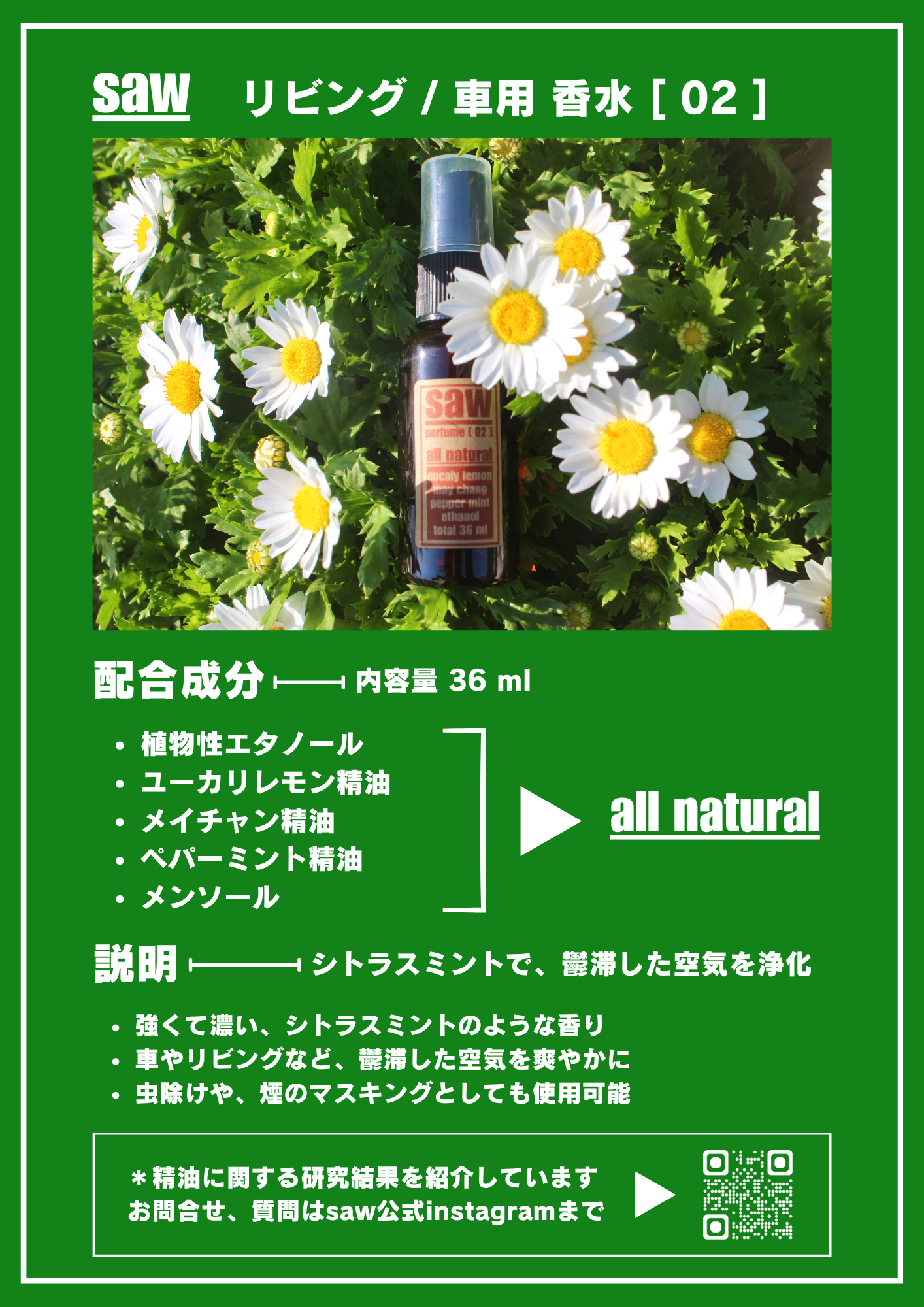 香りは、気分の状態に影響することが知られます。香りの雰囲気から、特定のシチュエーションに適した香りを調香したいと考えました。リビング / 車用 香水 02 は、シトラスミントの爽やかな香りで、鬱滞した重く嫌な空気感を取り除くために開発しました。
