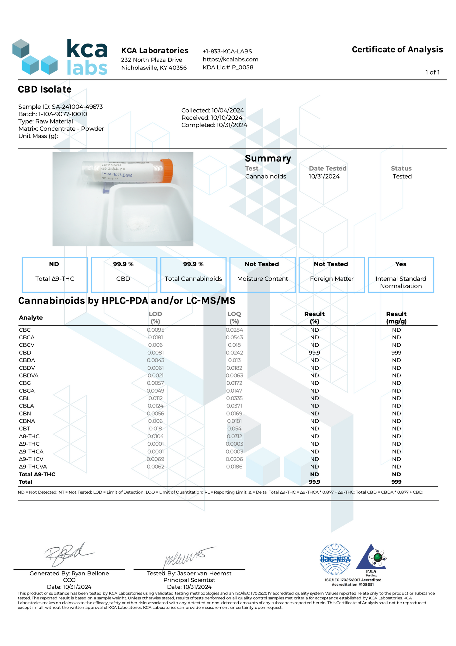 - CBD原料のCoA、Δ9-THCの残留濃度は0.1 ppm 未満